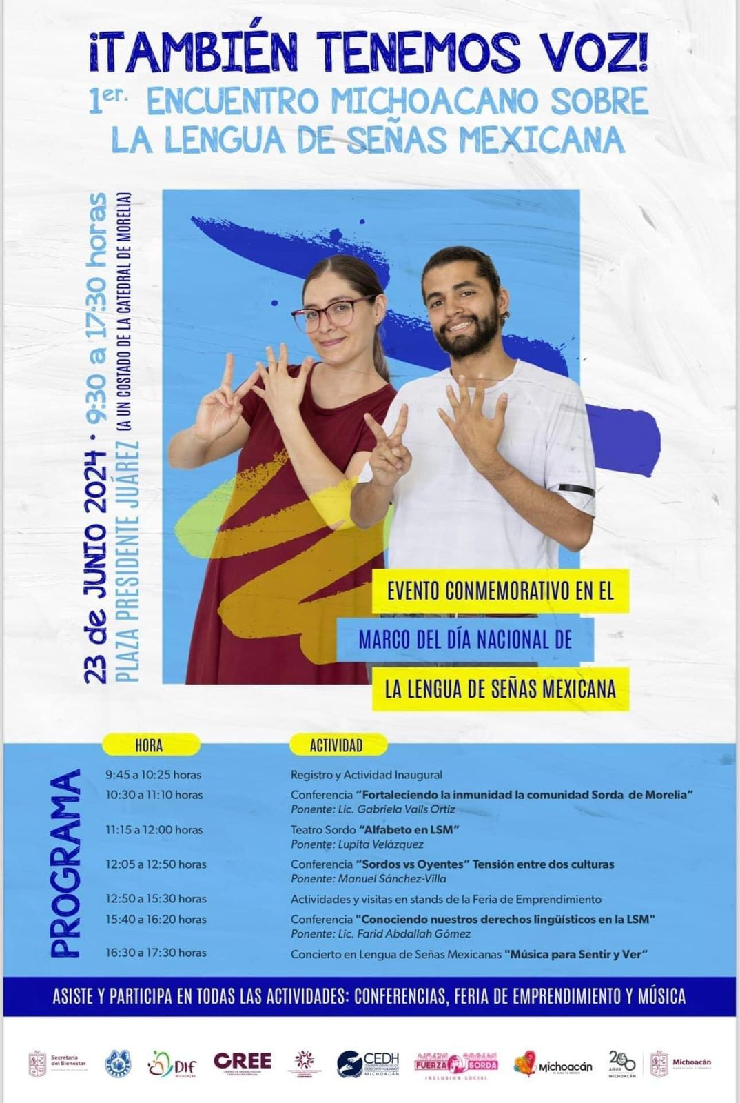 Morelia, Michoacán, 23 de junio de 2024.- Con la convicción de visibilizar y reconocer a la comunidad sorda del estado, este domingo se desarrolla el primer Encuentro Michoacano sobre la Lengua de Señas Mexicana en el andador Benito Juárez del Centro Histórico de Morelia, hasta las 18:00 horas.