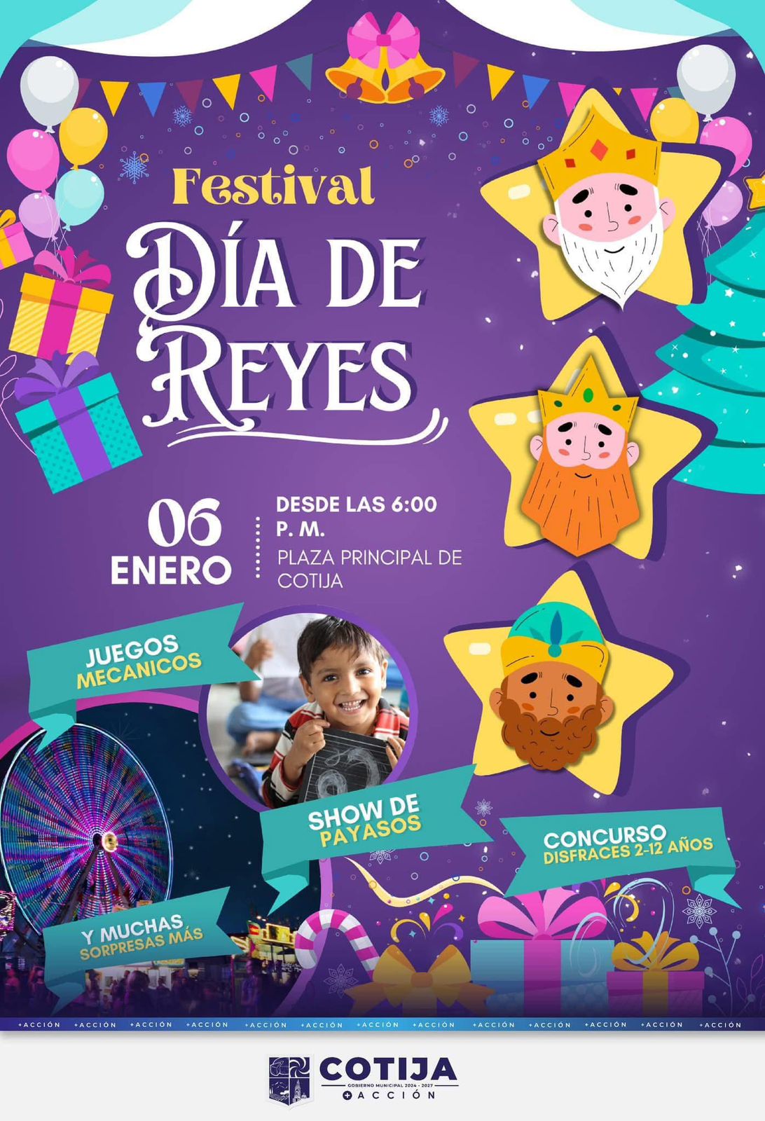 El Festival de Día de Reyes será un evento lleno de diversión, alegría y sorpresas para toda la familia que disfrutarán de concursos de disfraces, juegos mecánicos, regalos, espectáculos de payasos y muchas más sorpresas.