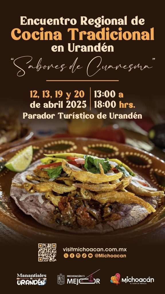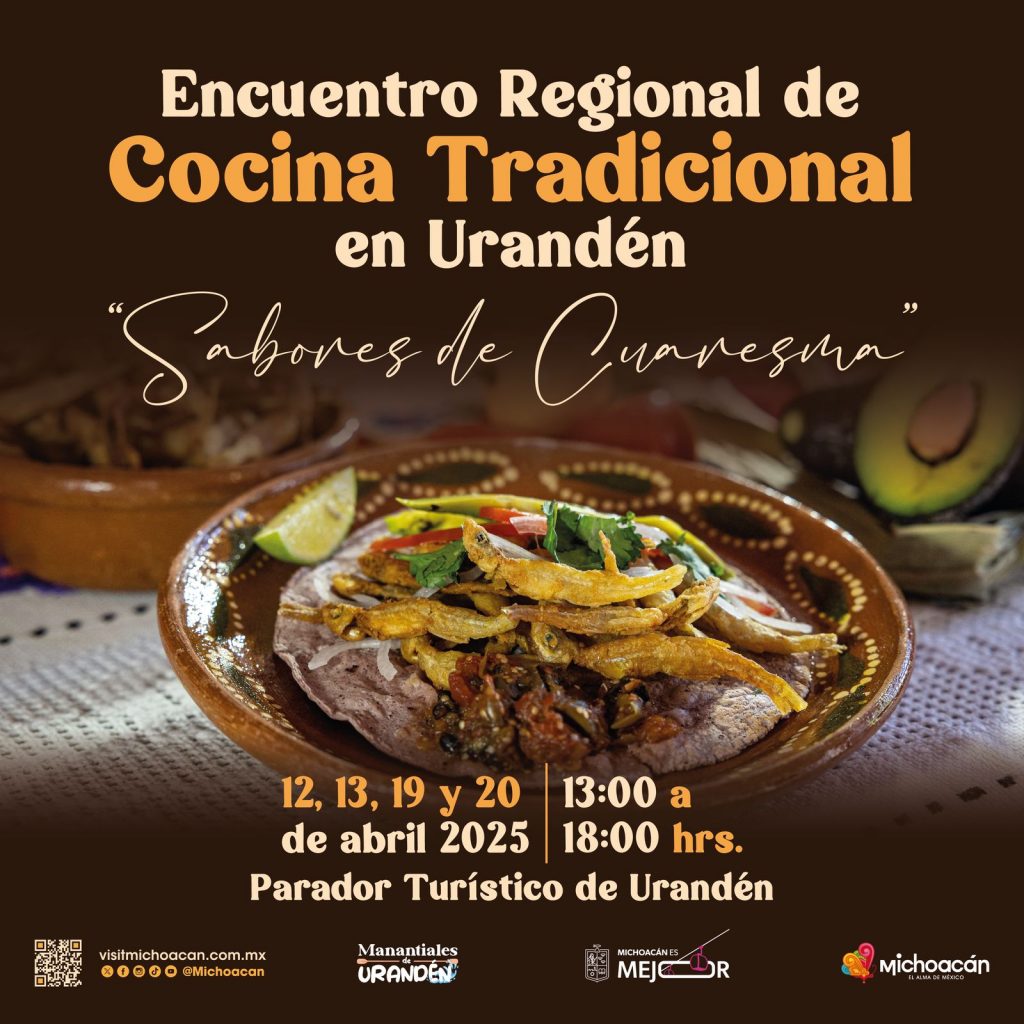 Morelia, Michoacán, 11 de abril de 2025.- Este fin de semana, Urandén será la sede de la primera edición del Encuentro Regional de Cocina Tradicional, sabores de Cuaresma, que reunirá en el parador turístico a 12 cocineras tradicionales de la región, recordó la Secretaría de Turismo de Michoacán (Sectur), encabezada por Roberto Monroy García.