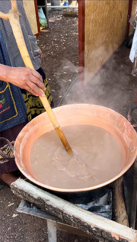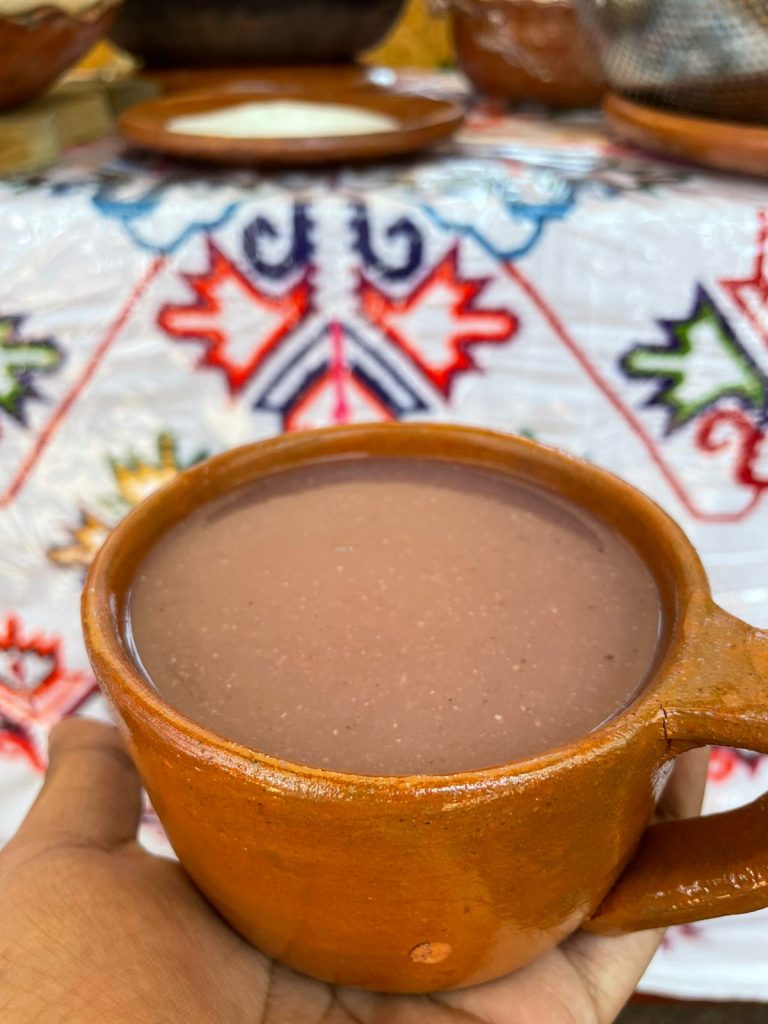 Preparando atole de pinole, doña María Inés cuenta que esa bebida se elabora con maíz colorado, el cual se desgrana, tuesta y muele, para llegar al pinole.
