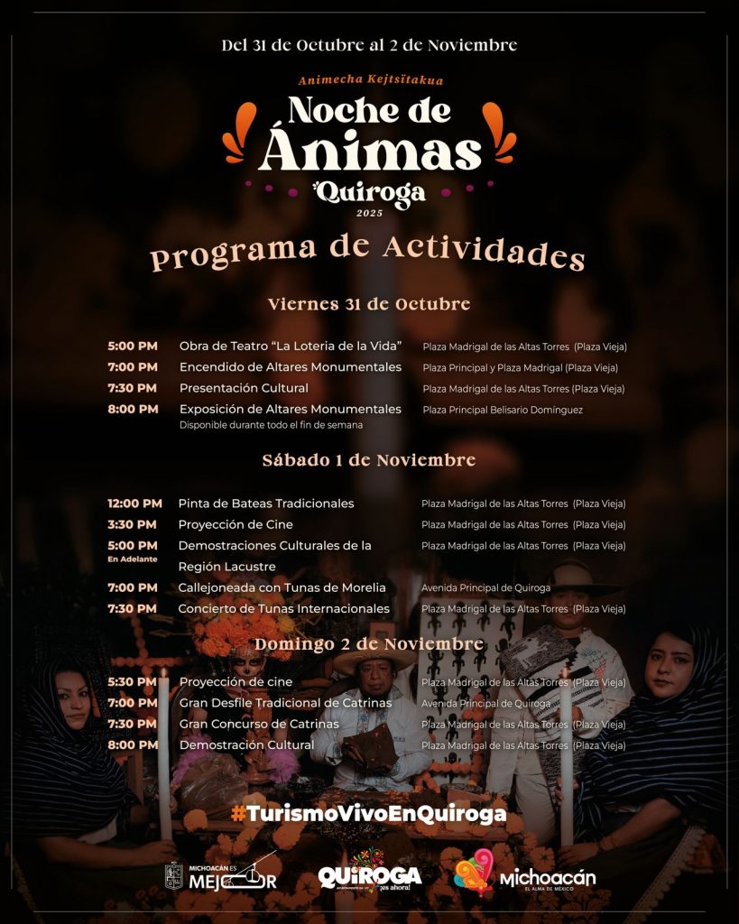 “Esta celebración viene a darle un realce a Quiroga en las tradiciones y la economía circular. El viernes 31 de octubre las actividades comenzarán a las 17:00 horas con la obra de teatro ‘La lotería de la vida’, y a las 19:00 horas se llevará a cabo el encendido de altares monumentales, ambos en la plaza Madrigal de las Altas Torres, también conocida como la plaza vieja”, informó la edil.