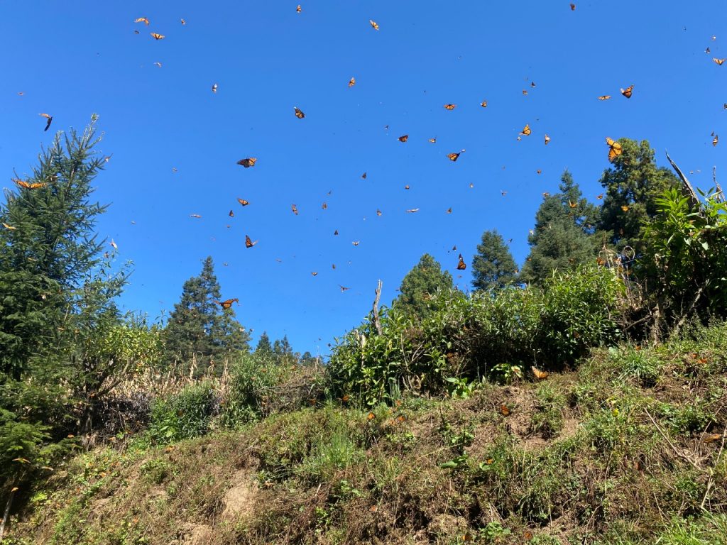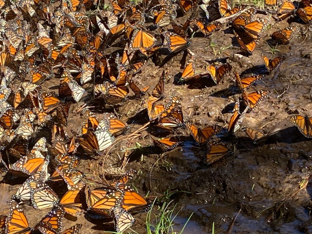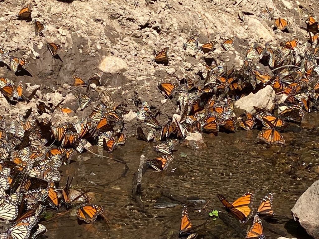 En estos días, debido al cambio de clima, el rayo del sol ayuda a que las mariposas salgan del letargo para bajar a los riachuelos o cuerpos de agua, donde se pueden observar por cientos. De igual forma revolotean cerca de los senderos que recorren los visitantes, y no permanecen perchadas en los arboles de oyamel como cuando comienza la temporada.