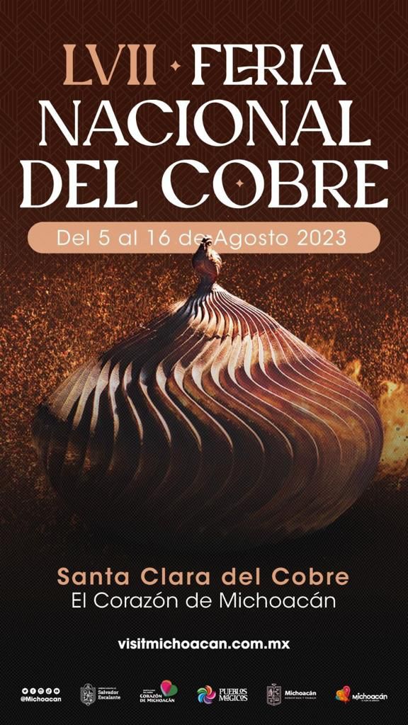 Morelia, Michoacán, 24 de julio de 2023.- La Secretaría de Turismo invita a la Feria Nacional del Cobre, la cual se desarrollará del 5 al 16 de agosto en Santa Clara del Cobre, donde se realizará la exposición y venta de artesanías, eventos culturales, gastronómicos, artísticos y deportivos.