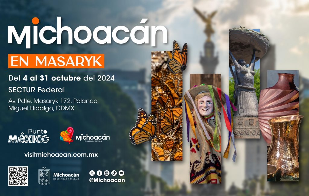 “Michoacán en Masaryk” es el nombre del evento con el que la Secretaría de Turismo del Estado, que encabeza Roberto Monroy García, difundirá todos los atractivos que turistas y visitantes podrán disfrutar en familia, con amigos o con la propia pareja, en el espacio denominado Punto México.