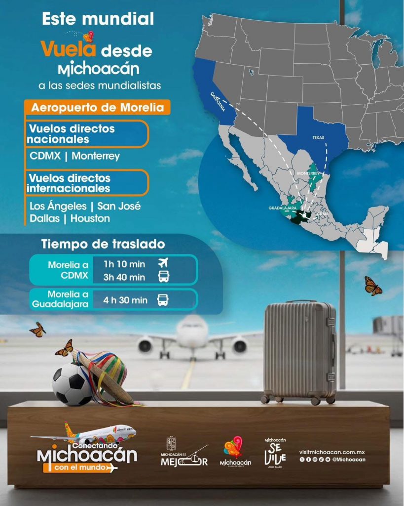 Morelia, Michoacán, 23 de diciembre de 2025.- Con una red de transporte aéreo que conecta directamente con las principales sedes de la Copa del Mundo 2026, Michoacán se posiciona como un punto logístico ideal para la afición que busca movilidad, eficiencia y costos accesibles durante la justa deportiva.