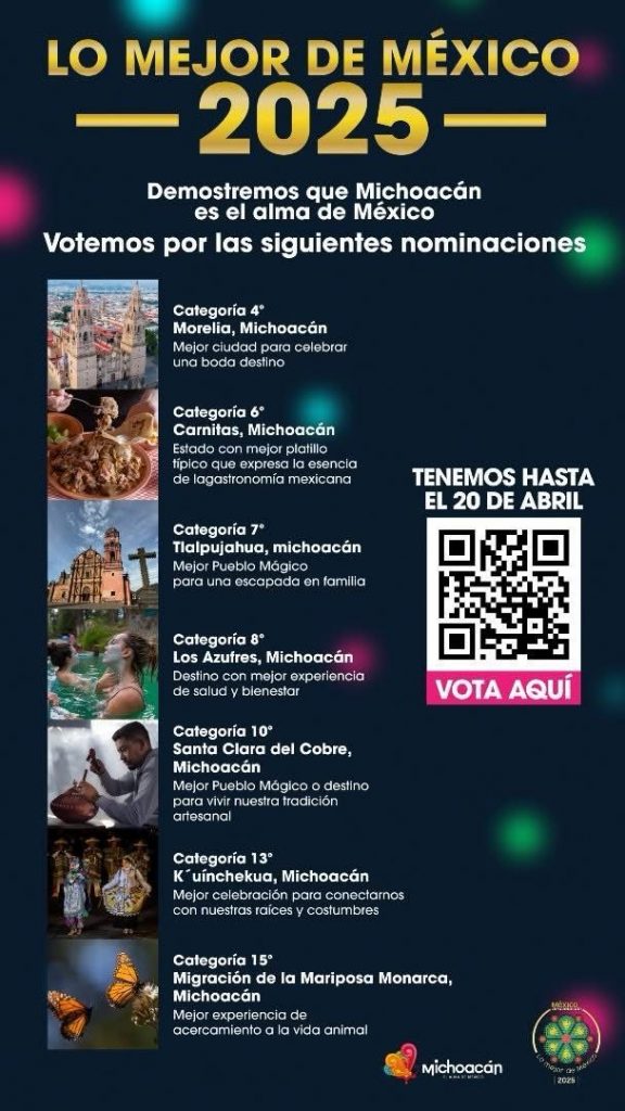 Morelia, Michoacán, 15 de abril de 2025.- El proceso de votación para los premios “Lo Mejor de México” 2025 está por cerrar, y Michoacán aún cuenta con tu voto para mostrar a nivel nacional la riqueza que existe en el estado.