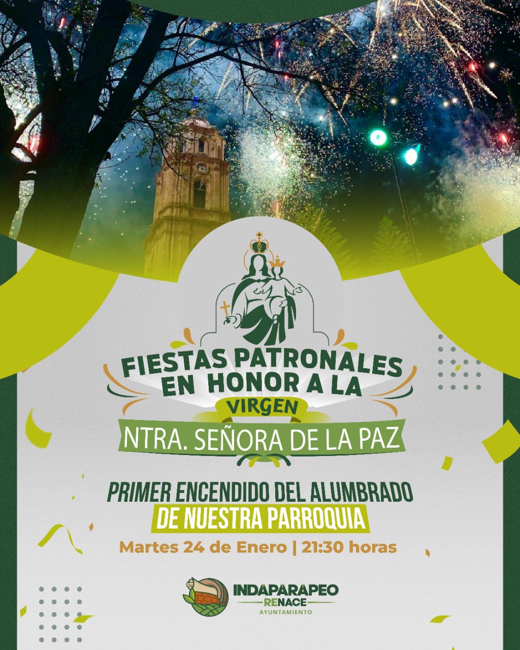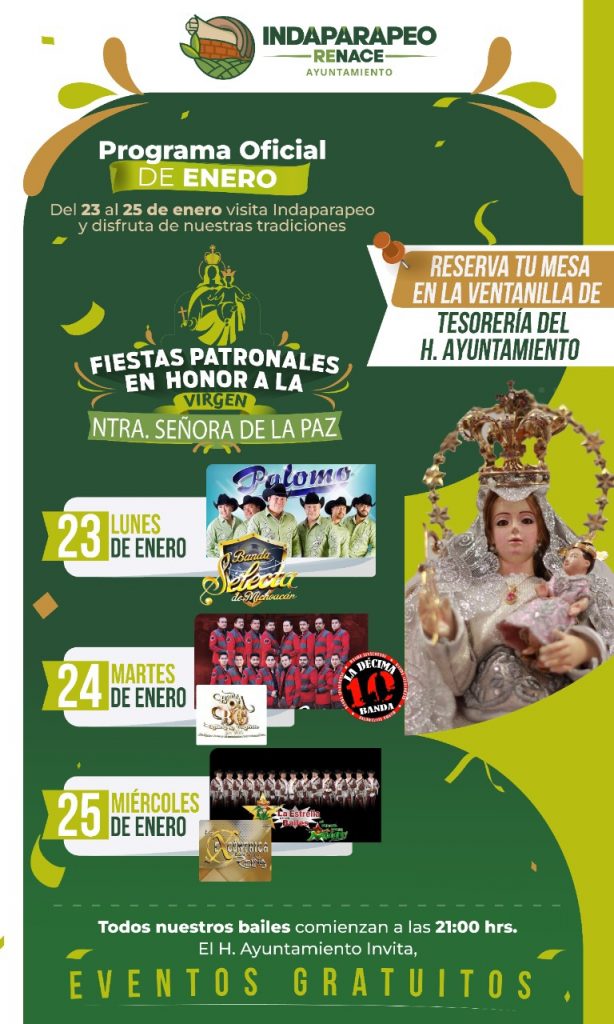 Morelia, Michoacán, 17 de enero del 2023.- Con el respaldo de la Secretaría de Turismo del Estado (Sectur), el municipio de Indaparapeo invitó a todo el público a sus Fiestas Patronales en honor a la Virgen “Nuestra Señora de la Paz”, a celebrarse del 22 al 25 de enero.