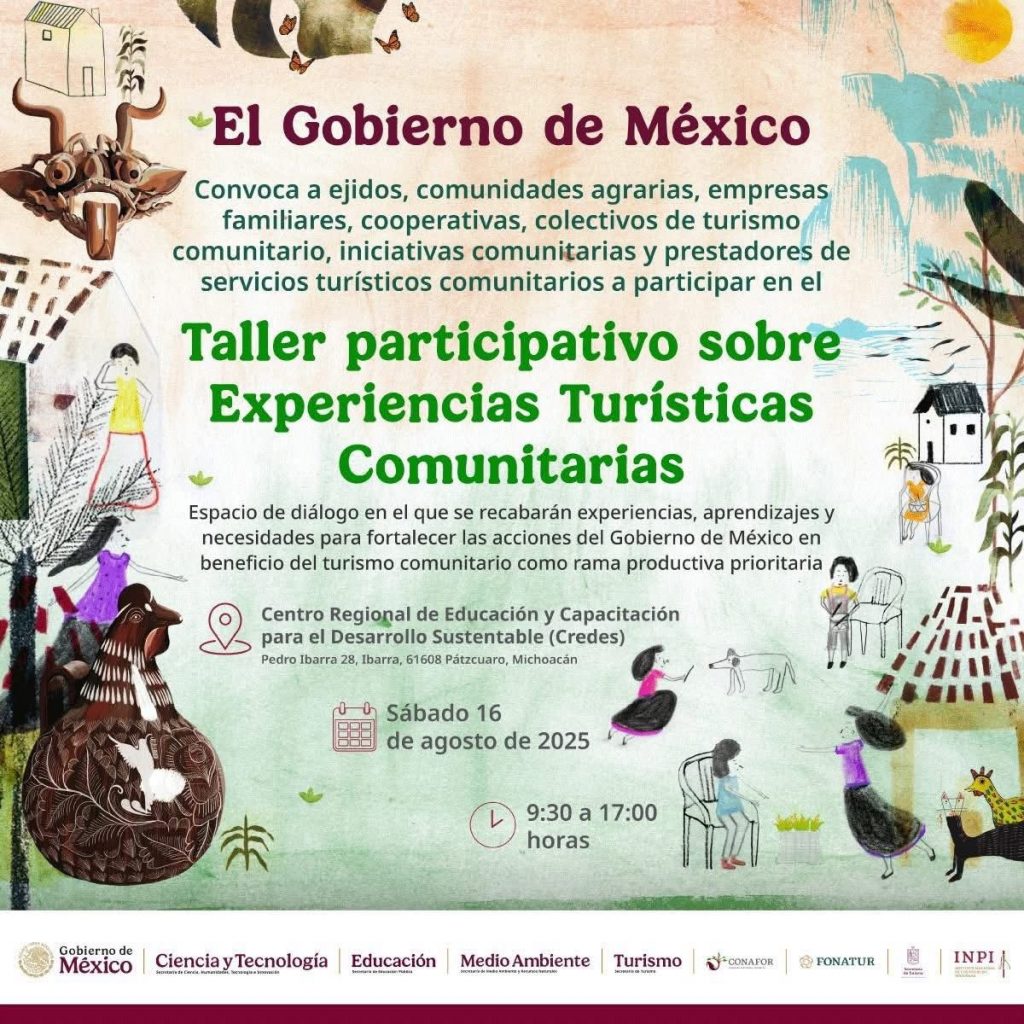 Morelia, Michoacán, 14 de agosto de 2025.- La Secretaría de Turismo de Michoacán (Sectur) informa que este sábado 16 de agosto se llevará a cabo el taller Experiencias Turísticas Comunitarias, el cual busca generar un punto de encuentro entre ejidos, comunidades agrarias, empresas familiares y cooperativas.