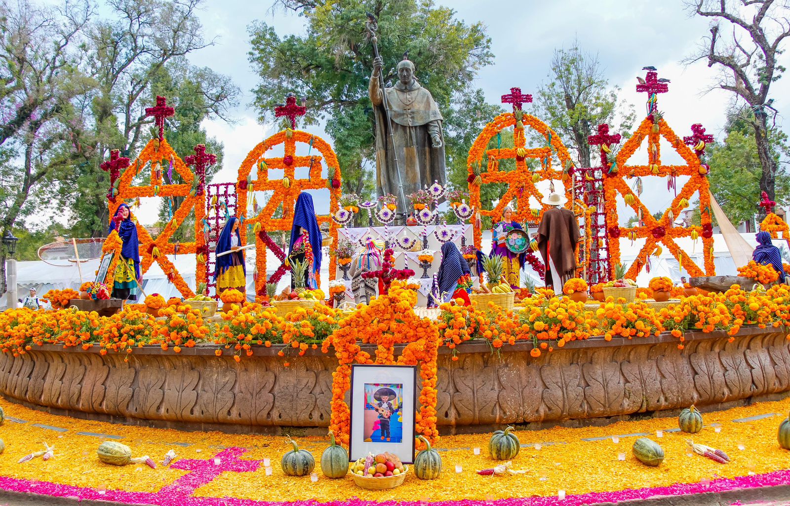 En varias comunidades purépechas, como Tzintzuntzan y Jarácuaro, es tradición colocar un arco de flores en cada altar de muertos. Este arco, hecho con cempasúchil y otras flores, simboliza la puerta que permite a las almas de los difuntos cruzar al mundo de los vivos y unirse a la celebración junto a sus seres queridos.