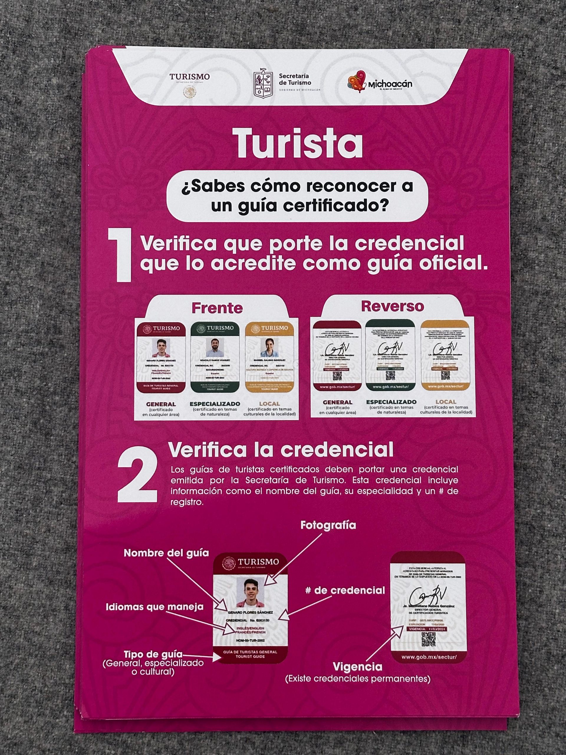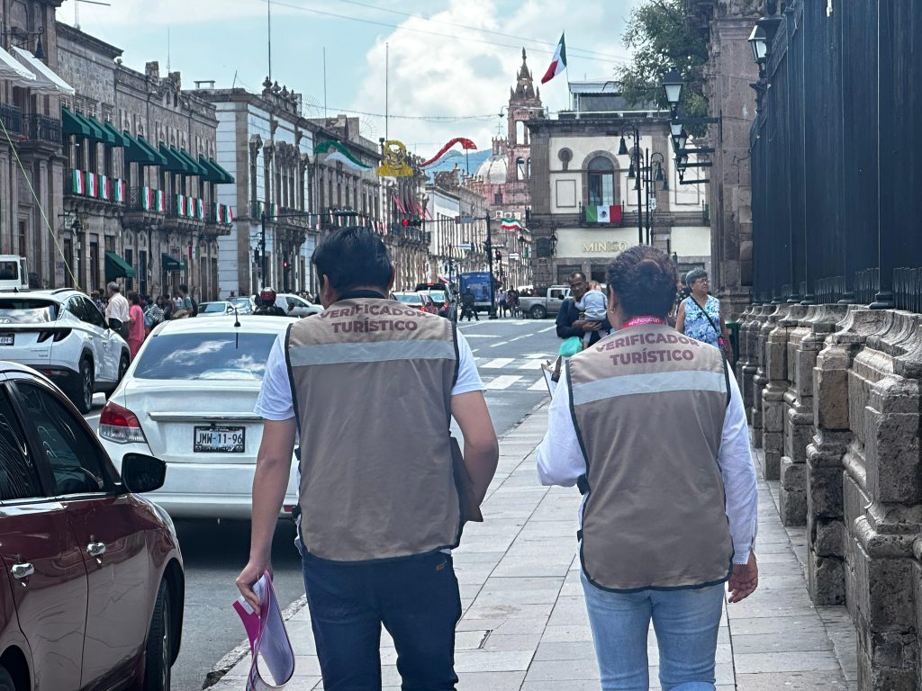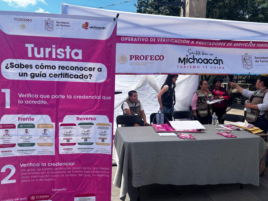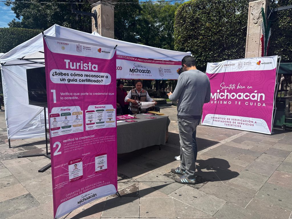 Morelia, Michoacán, 30 de agosto de 2024.- La Secretaría de Turismo de Michoacán (Sectur) inició el operativo de verificación de guías de turistas del Centro Histórico de Morelia, con la finalidad de identificar a las personas que se ostentan como expertos certificados y que ofrecen sus servicios a los visitantes.