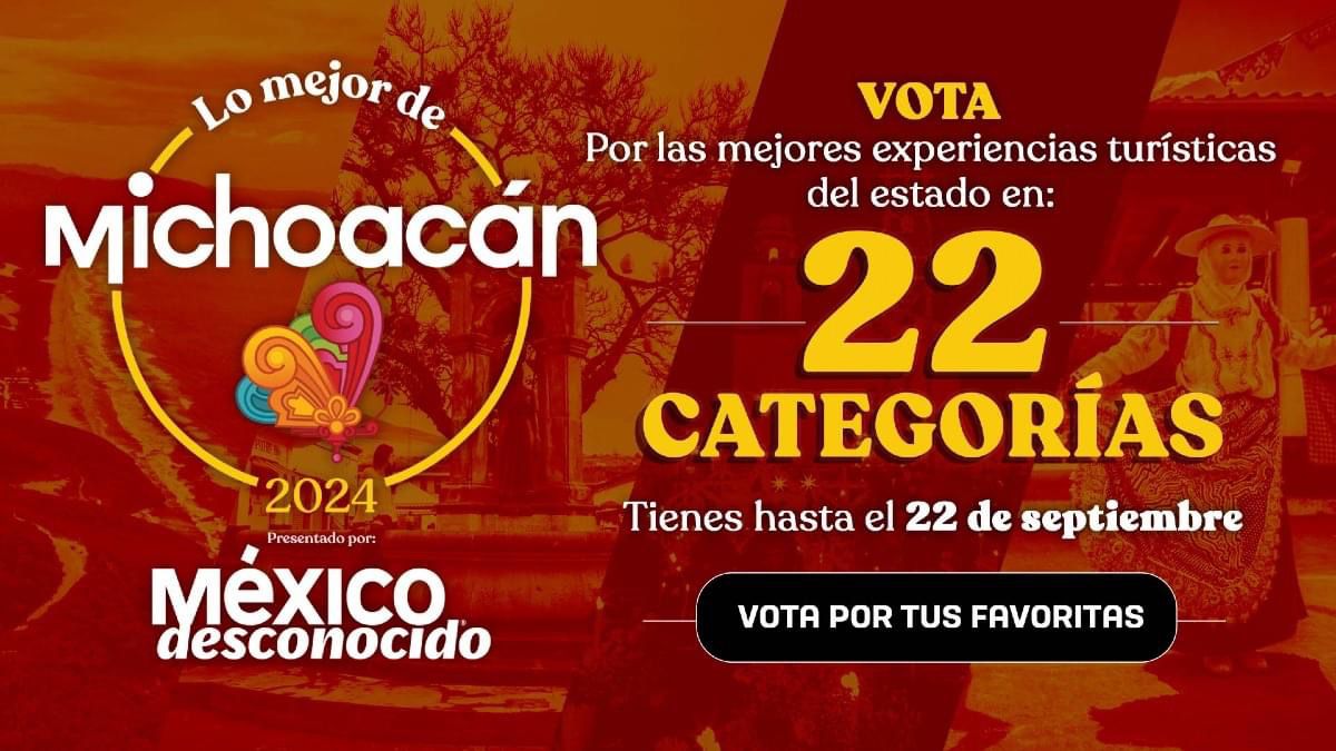 La sana competencia para seleccionar a “Lo Mejor de Michoacán”, premio otorgado por la revista México Desconocido, que reconoce lo mejor que existe en el país y en esta ocasión en el estado, ya comenzó de manera formal y se invita al público a emitir su voto en la página: www.lomejordemichoacan.com, recordó la Secretaría de Turismo de Michoacán (Sectur), dependencia encabezada por Roberto Monroy García.