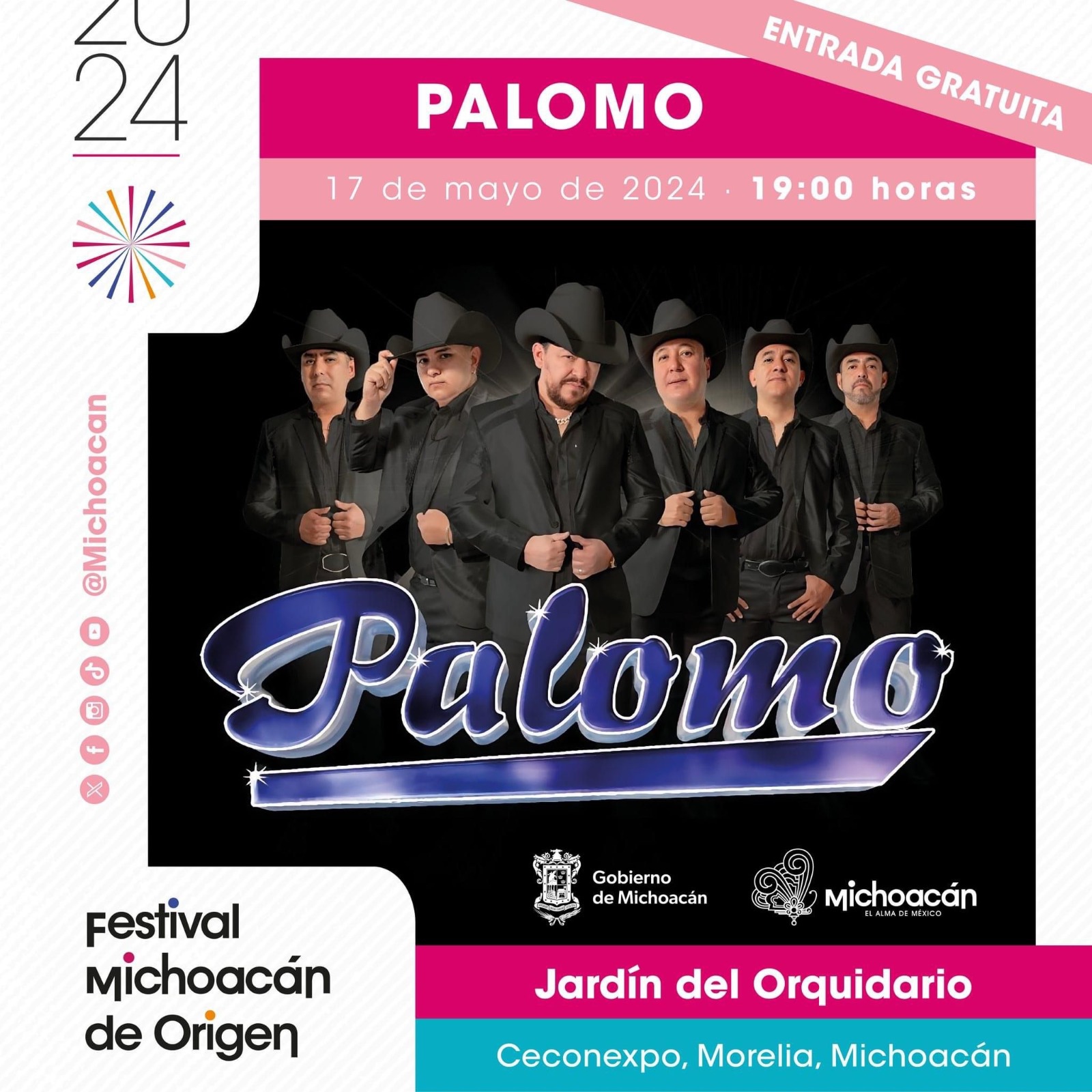 Morelia, Michoacán, 17 de mayo de 2024.- Grupo Palomo llega gratis este viernes 17 de mayo al Festival Michoacán de Origen (FMO) para marcar el inicio de la parte final de la edición 2024 de este evento 100 por ciento familiar, que desde el pasado 26 abril ha llenado de unión, sana convivencia y entretenimiento a michoacanos, turistas y visitantes.